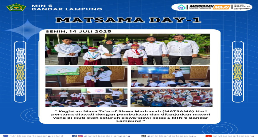 Bandar Lampung, (MIN 6) Humas –Senin, 14 Juli 2025. Kepala Madrasah Ibu Dr. Siti Romlah M.Pd membuka secara resmi pelaksanaan kegiatan Masa Ta’aruf Siswa Madrasah (MATSAMA) Tahun Pelajaran 2025/2026 yang diikuti oleh seluruh peserta didik baru kelas satu MIN 6 Bandar Lampung. Kegiatan pembukaan dilaksanakan di Lapangan Sekolah Min 6 Bandar Lampung .