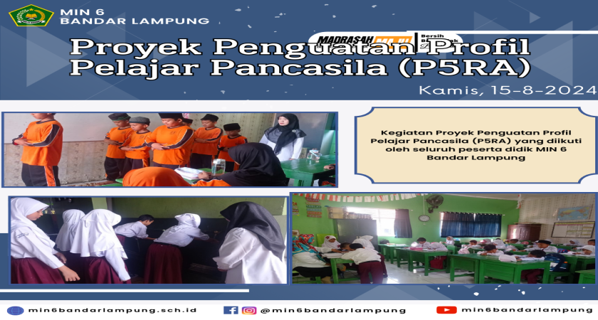 Kegiatan P5RA di MIN 6 Bandar Lampung dilaksanakan mulai tanggal 5 hingga 16 Agustus 2024 yang diikuti oleh seluruh siswa-siswi madrasah. Tema yang diusung dalam kegiatan P5RA ini adalah Bangunlah Jiwa dan Raganya. Kegiatan diawali dengan sholat dhuha berjamaah dan dilanjutkan dengan kegiatan Bimbingan Baca Qur’an untuk kelas 1 dan 2 serta bimbingan bacaan sholat dan praktek wudhu bagi kelas 3,4,5 dan 6. Kegiatan-kegiatan yang dilaksanakan tersebut diharapkan dapat meingkatkan iman dan takwa peserta didik kepada Tuhan Yang Maha Esa serta berakhlak mulia, berkebinekaan yang global, menimbukan rasa gotong-royong, mandiri, bernalar kritis dan kreatif. Hal ini msenunjukkan bahwa profil pelajar Pancasila tidak hanya fokus pada kemampuan kognitif, tetapi juga sikap dan perilaku sesuai jati diri sebagai bangsa Indonesia sekaligus warga dunia.