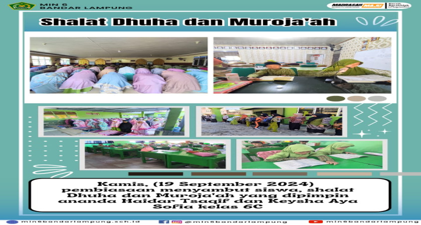 Bandar Lampung, (MIN 6) Humas – Kamis, 19 September 2024. Pembiasaan menyambut siswa, sholat dhuha dan muroja`ah di MIN 6 Bandar Lampung dilakukan setiap hari. Dengan rutinitas tersebut diharapkan mampu menumbuh kembangkan karakter anak didik yang baik dan membiasakan berakhlak mulia. Penguatan karakter dan sikap berakhlak mulia pada anak didik dapat dilaksanakan di ,manapun dan kapanpun, baik di dalam kelas maupun di luar kelas.